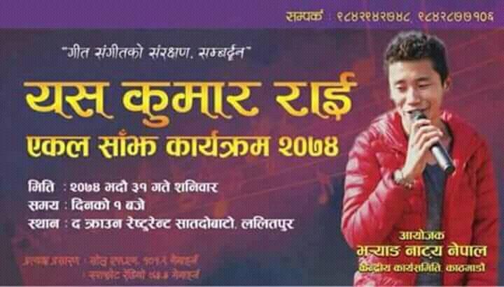 खोटाङ भदौ–३१, खोटाङका लफ्याङका नब प्रतिभा गायक यसकुमार राई एकल साँझ ललितपुरमा जारी छ । ‘गीत संगीतको संरक्षण–सम्बद्र्घन’ भन्दै भ¥याङ नाट्य मञ्च नेपाल केन्द्रीय कार्यालय काठमाण्डौंको आयोजनामा द क्राउन रेष्टुरेण्ट सातदोबाटोमा आज शनिबार अपरान्हदेखि जारी रहेको हो ।