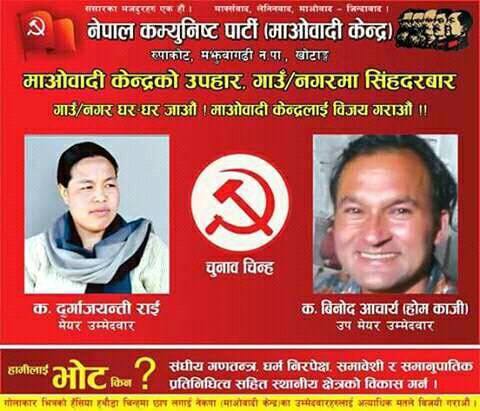 स्थानीय तहको दोस्रो चरण अन्तर्गत ३१ जेठमा हुन लागेको निर्वाचनका लागि माओवादी केन्द्रले रुपाकोट मझुवागढी नगरपालिकामा मेयरमा दुर्गाजयन्ती राई र उप–मेयरमा विनोद आचार्यलाइ उम्मेदवार बनाउने भएको हो ।