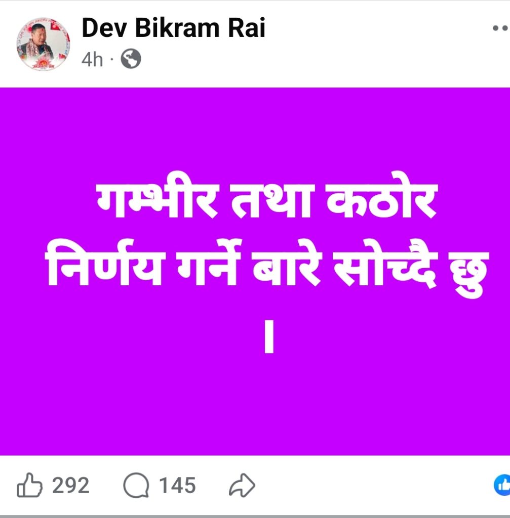 प्रतिनिधि चयनकाे विषय पेचिलाे बन्दै जाँदा जिल्ला अध्यक्ष देव विक्रम राईले कठाेेर निर्णय गर्नेमा पुगेकाे उल्लेख गरेका छन् । ‘गम्भीर र कठाेर निर्णयबारे साेच्दैछु ।’ सामाजिक सञ्जाल फेसबुकमा उनले लेखेका छन् ।