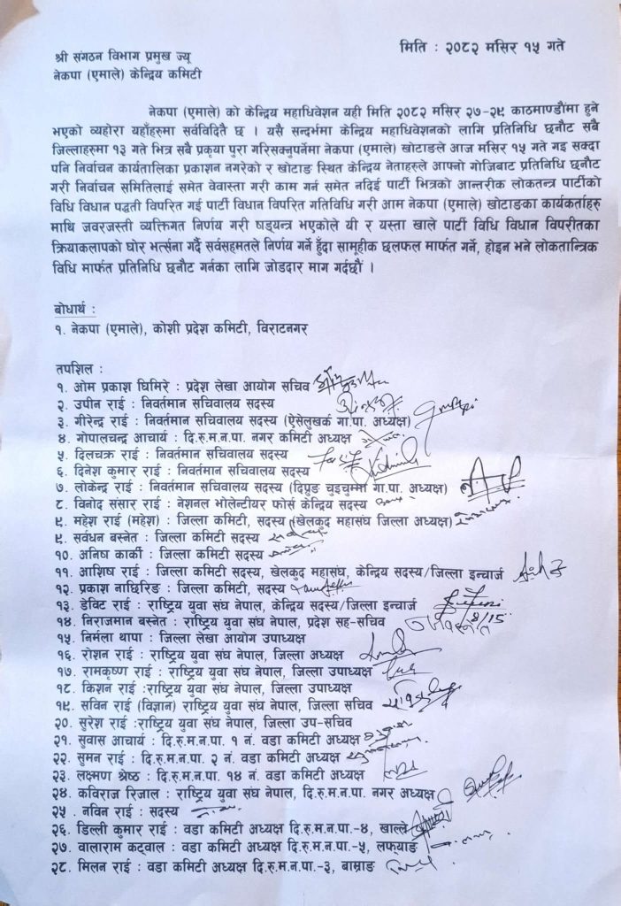 तीन दिनकाे छलफलपछि जिल्ला अध्यक्ष देवविक्रम राईले सार्वजनिक गरेको सूचीप्रति असहमति जनाउँदै २८ जना युवा नेताले वक्तव्य जारी गरेका छन् । उनीहरूले पार्टीको विधानविपरीत प्रतिनिधि छनोट गरिएकाले सच्याउन माग गरेका छन् ।