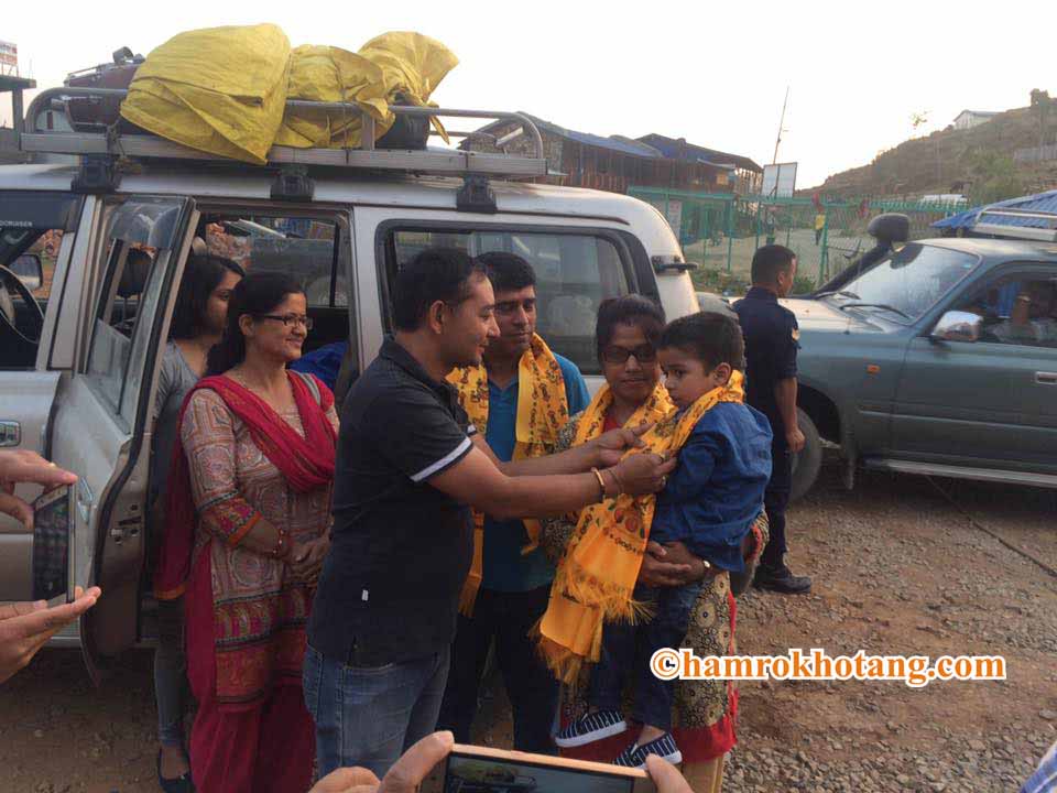 स्वागत गर्दै होटल हलेसी भिलेजका सञ्चालक राजेन्द्र लयालु । तस्बिर सौजन्यः राजेन्द्र लयालु