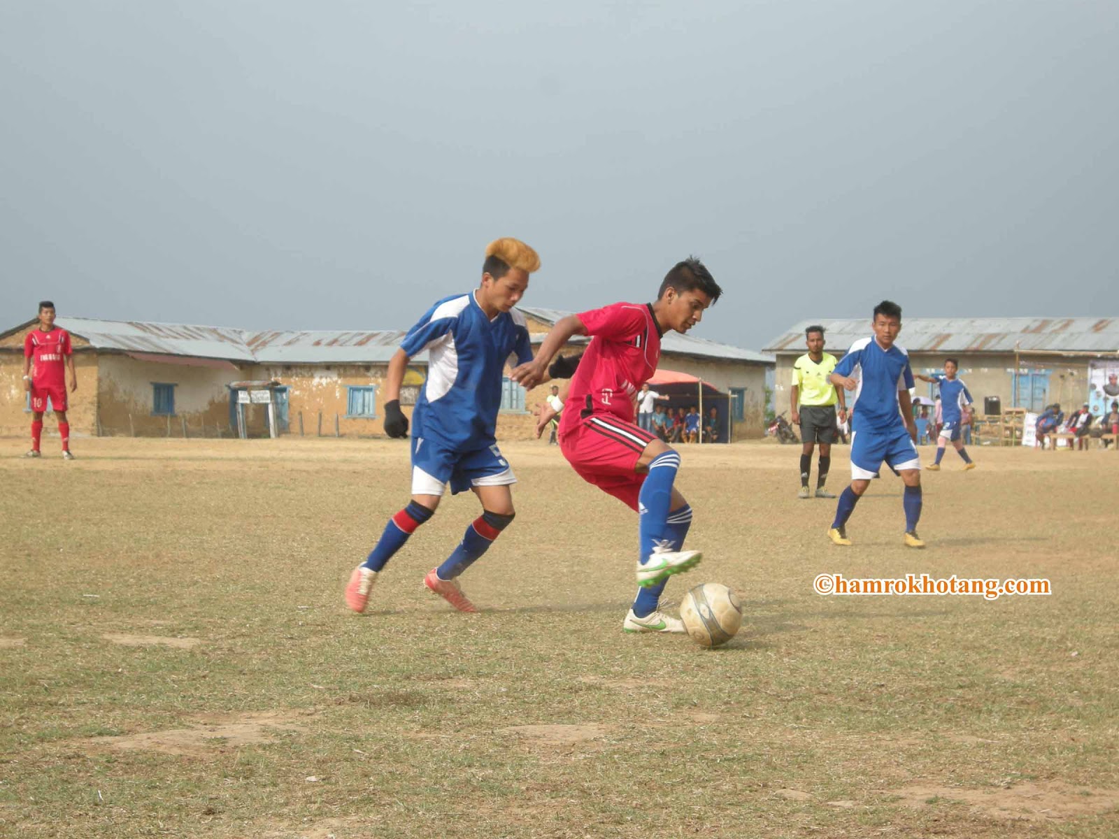 फुटबल आफ्नोपक्षमा पार्ने प्रयास गर्दै सोल्मा स्पोर्टस क्लव (निलो) र शान्तिनगर फुटबल क्लव इटहरी (रातो)का खेलाडी ।