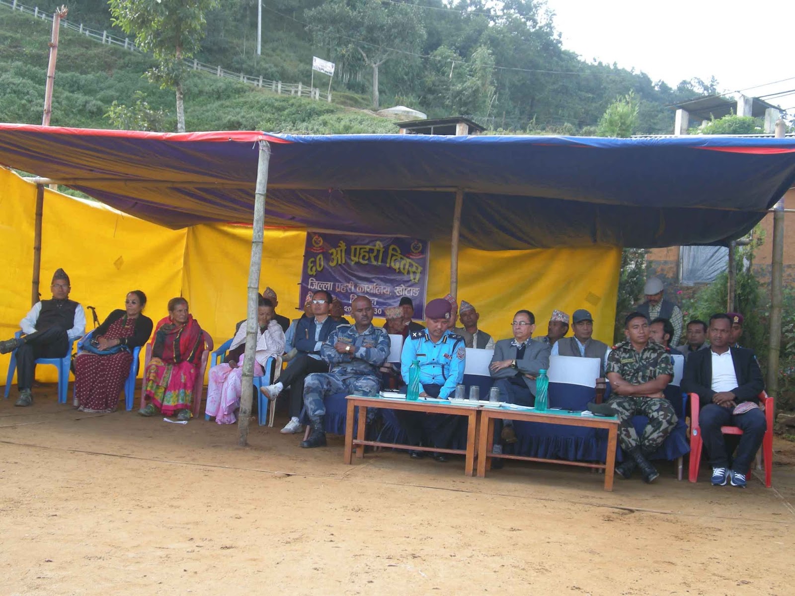 ६० औं प्रहरी दिवसमा जिल्ला प्रहरी कार्यालय खोटाङले आयोजना गरेको कार्यक्रममा उपस्थित अतिथिहरु । कार्यक्रमका अवशरमा प्रहरीचौकीका जग्गादाता र शहिद प्रहरीका आफन्तलाई सम्मान गरिएको छ । कार्यक्रममा प्रमुख जिल्ला अधिकारी रुद्र प्रसाद खड्का, डिएसपी विद्यानन्द माझी लगायतको उपस्थिति रहेको थियो ।