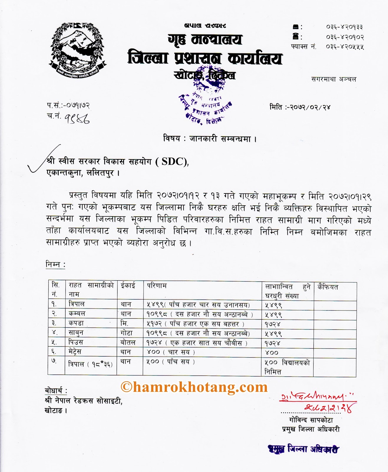 जेठ–२६, स्वीस सरकारबाट खोटाङका भूकम्प पिडितलाई पाँच हजारभन्दा बढि त्रिपाल प्राप्त भएको छ । बैसाख–१२ गतेको महाभूकम्प र सो को पराकम्पनका कारण घर भत्किएर अलपत्र बनेका पिडितको सहयोगकालागि जिल्ला दैबीप्रकोप उद्धार समितिको आग्रहमा स्वीस सरकार बिकास सहयोगबाट पाँच हजारभन्दा बढि थान त्रिपाल प्राप्त भएको हो ।