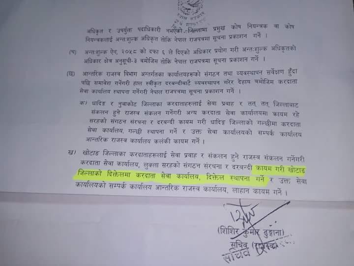 अर्थ मन्त्रालयका सचिव शिशिर कुमार ढुंगानाका अनुसार खोटाङ जिल्लाका करदाताहरुलाई सेवा प्रवाह र संकलन हुने राजस्व संकलन गर्ने गरी करदाता सेवा कार्यालय, लुक्ला सरहको संगठनको संरचना र दरबन्दी कायम गरी दिक्तेलमा करदाता सेवा कार्यालय स्थापना गर्ने र उक्त सेवा कार्यालयको सम्पर्क कर्यालय आन्तरिक राजस्व कार्यलय, लाहान रहने छ ।