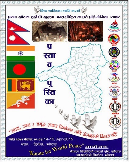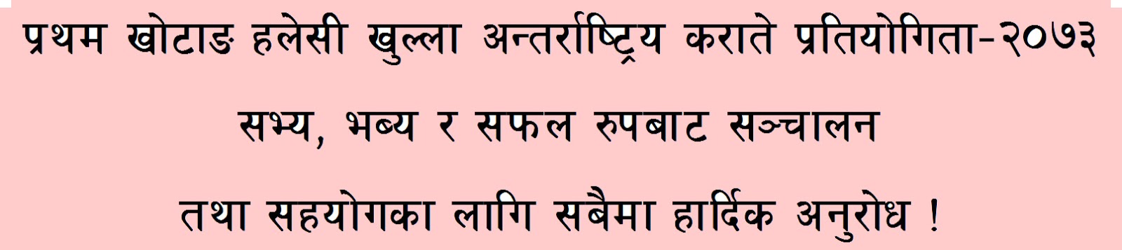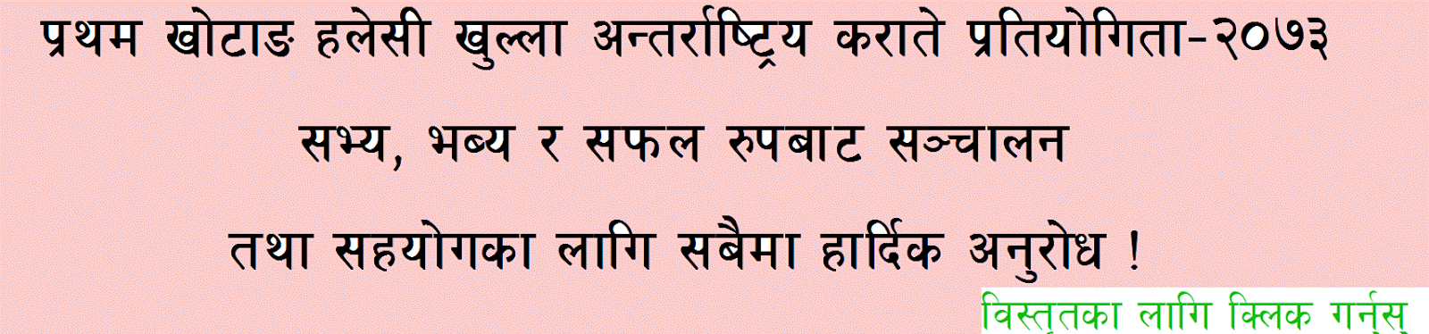 नेपाल सितोरियो कराते संघको स्वीकृति अनुसार प्रमुख जिल्ला अधिकारी श्री गोविन्द सापकोटा ज्यूको संयोजकत्व तथा जिल्ला सितोरियो कराते संघ, खोटाङको आयोजनामा २०७२ बैशाख १ गते देखी ३ गते सम्म यस जिल्लामा ऐतिहासिक “प्रथम खोटाङ हलेसी खुल्ला अन्तर्राष्ट्रिय कराते प्रतियोगिता–२०७२” गरिने भएको हुँदा यस प्रतियोगितालाई सभ्य, भव्य र सफल रुपमा सञ्चालन गर्नको निम्ती सम्पुर्ण खोटाङे तथा गैह्रखोटाङे घरदेश तथा परदेशमा रहनुहुने समाजसेवी, विशिष्ट व्यक्ति व्यक्तित्व, नागरिक समाज, राजनितिककर्मि, सरकारी गैह्रसरकारी संघसंस्था, व्यपारी व्यावसायी, शिक्षक विद्यार्थि, पत्रकार, खेलाडि पुर्व खेलाडि, खेलकुदप्रेमी अभिभावक ज्यूहरुमा आर्थिक, नैतिक, भौतिक, वैचारिक तथा अन्य सवैखाले सहयोग गरी खोटाङ जिल्लामा रहेका खेलाडिहरुको विकास विस्तार एवं उन्नति प्रगतिका लागि साथै खोटाङ जिल्ला लाई खेलकुदको मध्यमवाट राष्ट्रिय तथा अन्तराष्ट्रिय स्तरमा चिनाउन सहयोग गरी प्रतियोगिता सफल पारीदिनुहुन सम्पुर्णमा हार्दिक अनुरोध गर्दछौं ।