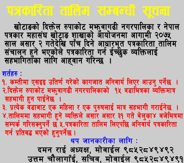 सम्पर्क नं. ०३६४२०५९०/९८४२२६०६५६/९७४१०१३५७९/९७४३०३३९१६/९८४२९४२१८२