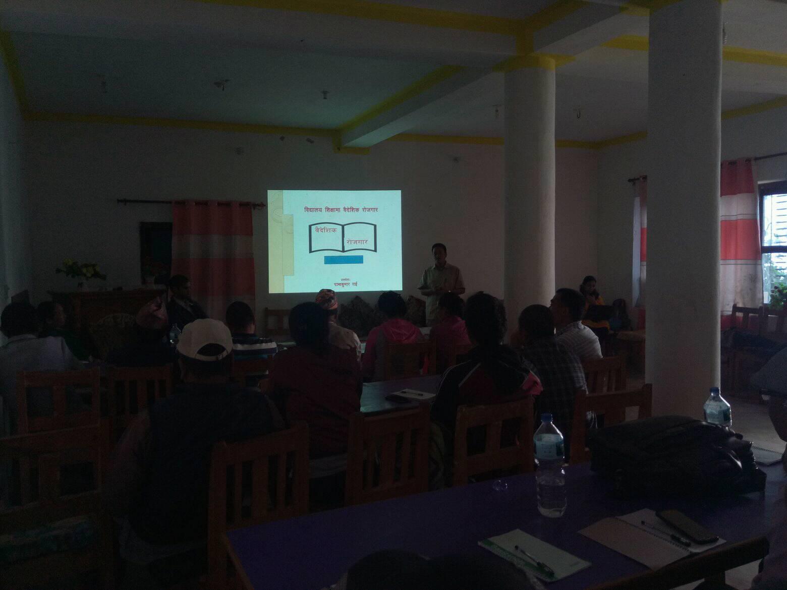 कार्यक्रममा नगर शिक्षा विभागका प्रमुख पञ्चकुमार राईले विद्यालय पाठ्यक्रममा वैदेशिक रोजगारबारे प्रस्तुति गर्नुभएको थियो । उहाँले स्थानीय तह र वैदेशिक रोजगारबारे समेत प्रस्तुति गर्नुभएको थियो । यस्तै, शिक्षा तथा समन्वय इकाई प्रमुख ठाकुरप्रसाद दाहालले वैदेशिक रोजगार छात्रवृति सम्बन्धी विद्यालयको जिम्मेवारी लगायत जानकारी गराउनुभएको थियो ।