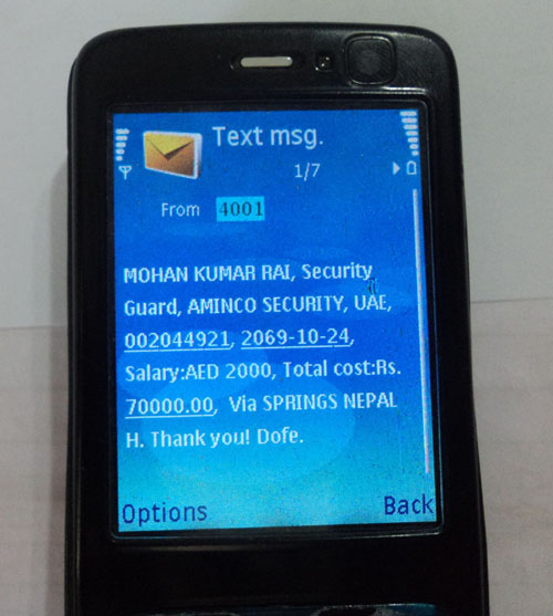 तर, बिभागको एसएमएसले देखाएजस्तो मोहनकुमार भने अहिले अमिनको सेक्यूरिटी सर्भिस कम्पनीमा नभै इमिरेट्स ट्रान्सपोर्टेशन कम्पनीमा कार्यरत हुनुहुन्छ ।