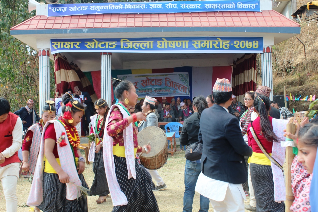 खोटाङ फागुन–२, “समग्र खोटाङ समुन्नतिको निकास ;ज्ञान, सीप, संस्कार, साक्षरताको विकास” भन्ने नारासहित खोटाङलाई साक्षर जिल्ला घोषणा गरिएको छ । जिल्लामा रहेका १५ देखि ६० बर्ष उमेर समुहका ९६ दशमलब ५६ प्रतिशत नागरिक साक्षर पाईएपछि बुधबार सदरमुकाम दिक्तेलबजारमा बिशेष कार्यक्रमको आयोजना गरी औपचारिक रुपमा साक्षर जिल्ला घोषणा गरिएको हो ।