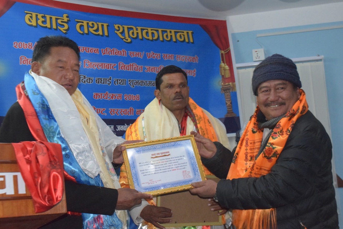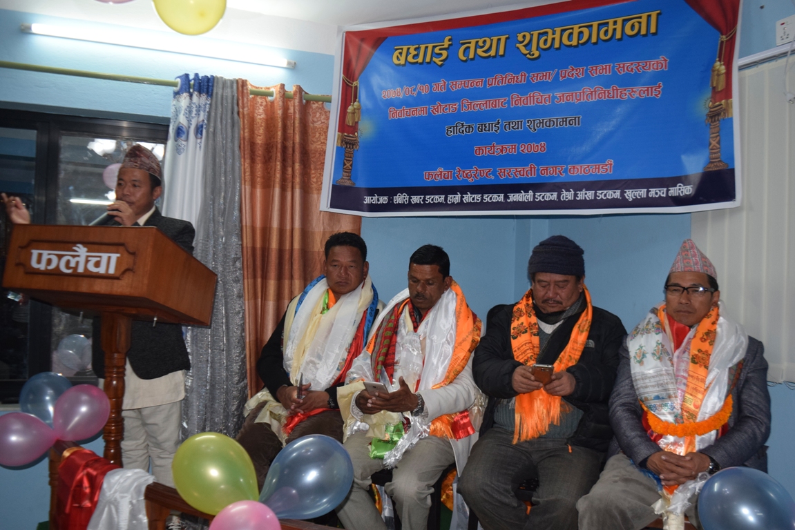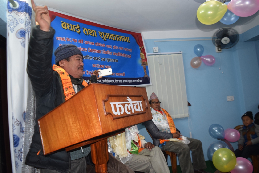 कार्यक्रममा प्राध्यपक तथा लेखक डा धनप्रसाद सुबेदीले नवनिर्वाचित प्रतिनिधि सभा र प्रदेशसभाका विजयी नेताहरुलाई शुभकामना व्यक्त गरे ।