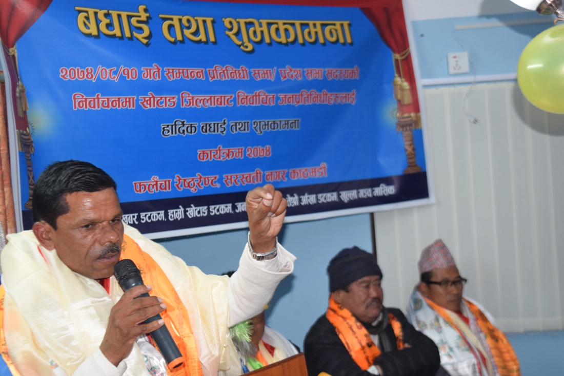 हाम्रोखोटाङ डटकमसहित खोटाङे पृष्ठभूमिका विभिन्न मिडियाद्धारा शनिबार काठमाडौंमा संयुक्त रुपमा आयोजना गरेको जनप्रतिनिधिलाई बधाई तथा शुभकामना कार्यक्रममा बोल्दै नेता राईले खोटाङे जनताले नचाहेमा संसारका जुनसुकै शक्ति लागे पनि खोटाङको समृद्धि सफल नहुने भन्दै खोटाङे जनता आफैं अघि सर्नुपर्ने बताए ।